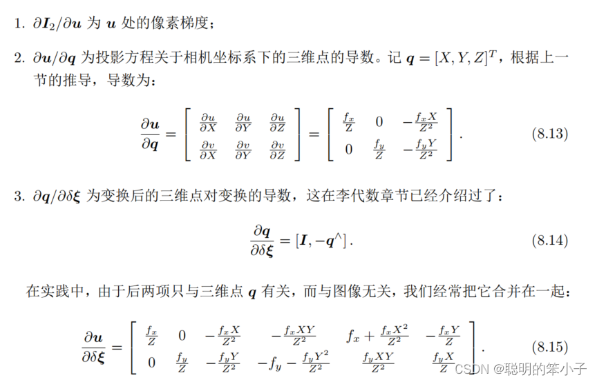 的变化而变化的,即求解误差e关于相机位姿的雅可比矩阵。使用李代数的左扰动法,就有: