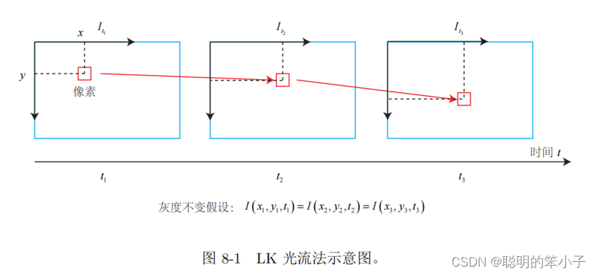 随着时间的经过,同一个像素会在图像中运动,而追踪它运动过程的方法称为光流法。计算部分像素运动的称为稀疏光流,计算所有像素的称为稠密光流。稀疏光流法有Lucas-Kanade光流法,如下所示: