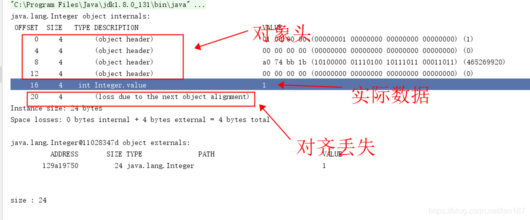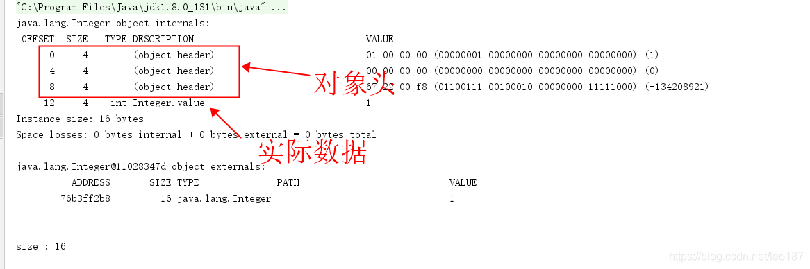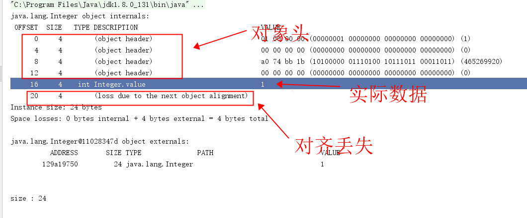 public static void main(String[] args) {int i = 1;//查看对象内部信息System.out.println(ClassLayout.parseInstance(i).toPrintable());//查看对象外部信息System.out.println(GraphLayout.parseInstance(i).toPrintable());//获取对象总大小System.out.println("size : " + GraphLayout.parseInstance(i).totalSize());
