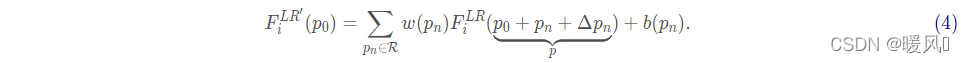 w ( p n ) w(p_n) w(pn)为卷积核位置 p n p_n pn的可学习参数, p 0 p_0 p0为 F i L R F_{i}^{LR} FiLR的整数格点位置, F i L R ′ F_i^{LR'} FiLR′就是可变形卷积的输出,可变形卷积的具体过程可表示成: