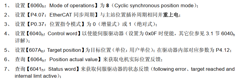 {EtherCAT_write8(slvcnt, 0x1C12, 00, 0); // 1 停止PDO分配功能(将0x1C12和0x1C13的子索引0设置为0) EtherCAT_write8(slvcnt, 0x1600, 00, 0); // 2 停止PDO映射功能(将0x1600~0x1603和0x1A00~0x1A03的子索引0全部设置为0)EtherCAT_write32(slvcnt, 0x1600, 01, 0x60400010); // 3 设置PDO映射对象(0x1600~0x1603和0x1A00~0x1A03)的映射入口EtherCAT_write32(slvcnt, 0x1600, 02, 0x607A0020); // 3 设置PDO映射对象(0x1600~0x1603和0x1A00~0x1A03)的映射入口EtherCAT_write8(slvcnt, 0x1600, 00, 2); // 4 设置PDO映射对象(0x1600~0x1603和0x1A00~0x1A03)映射入口的数值EtherCAT_write16(slvcnt, 0x1C12, 01, 0x1600); // 5 设置PDO分配对象(设置0x1C12和0x1C13的子索引1);EtherCAT_write8(slvcnt, 0x1C12, 00, 1); // 6 重新打开PDO分配功能(将0x1C12和0x1C13的子索引0设置为1)/**********************************************************************************************************/EtherCAT_write8(slvcnt, 0x1C13, 00, 0); // 1 停止PDO分配功能(将0x1C12和0x1C13的子索引0设置为0) EtherCAT_write8(slvcnt, 0x1A00, 00, 0); // 2 停止PDO映射功能(将0x1600~0x1603和0x1A00~0x1A03的子索引0全部设置为0)EtherCAT_write32(slvcnt, 0x1A00, 01, 0x60410010); // 3 设置PDO映射对象(0x1600~0x1603和0x1A00~0x1A03)的映射入口EtherCAT_write32(slvcnt, 0x1A00, 02, 0x60640020); // 3 设置PDO映射对象(0x1600~0x1603和0x1A00~0x1A03)的映射入口EtherCAT_write8(slvcnt, 0x1A00, 00, 2); // 4 设置PDO映射对象(0x1600~0x1603和0x1A00~0x1A03)映射入口的数值EtherCAT_write16(slvcnt, 0x1C13, 01, 0x1A00); // 5 设置PDO分配对象(设置0x1C12和0x1C13的子索引1);EtherCAT_write8(slvcnt, 0x1C13, 00, 1); // 6 重新打开PDO分配功能(将0x1C12和0x1C13的子索引0设置为1)EtherCAT_write8(slvcnt, 0x6060, 00, 8); //设置操作模式 :周期性同步位置模式return 0;