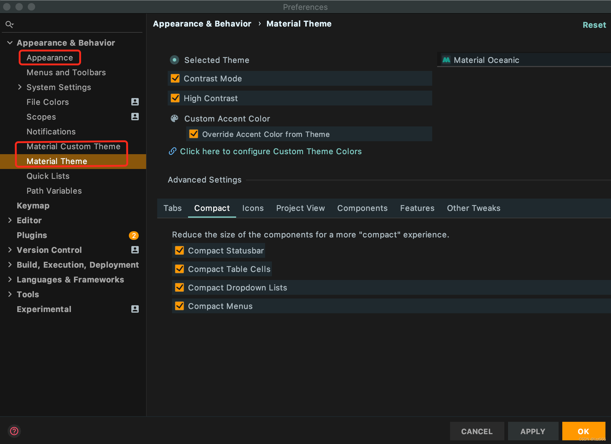 在preferences>plugins中搜索“Material Theme”安装两个中的一个