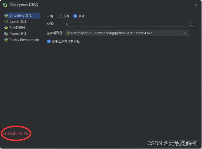 更改成刚刚下载的解释器,发现新问题环境位置目录非空