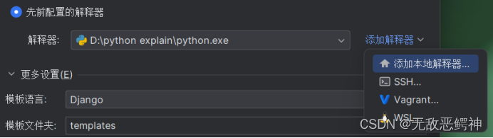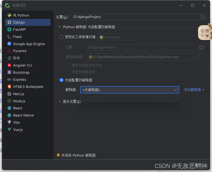 然后新建django项目更改使用本地解释器,图中文件地址是我之前试错建的文件删掉仍在