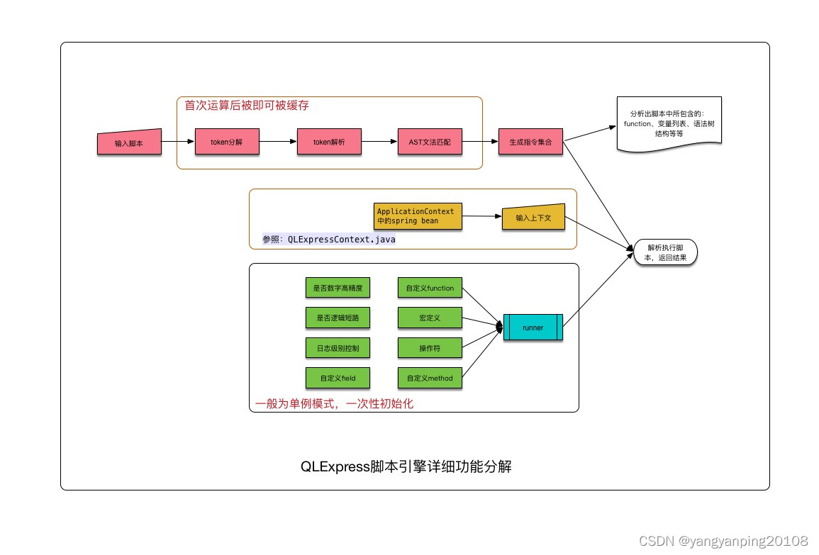 QLExpressRunner如下图所示,从语法树分析、上下文、执行过程三个方面提供二次定制的功能扩展。