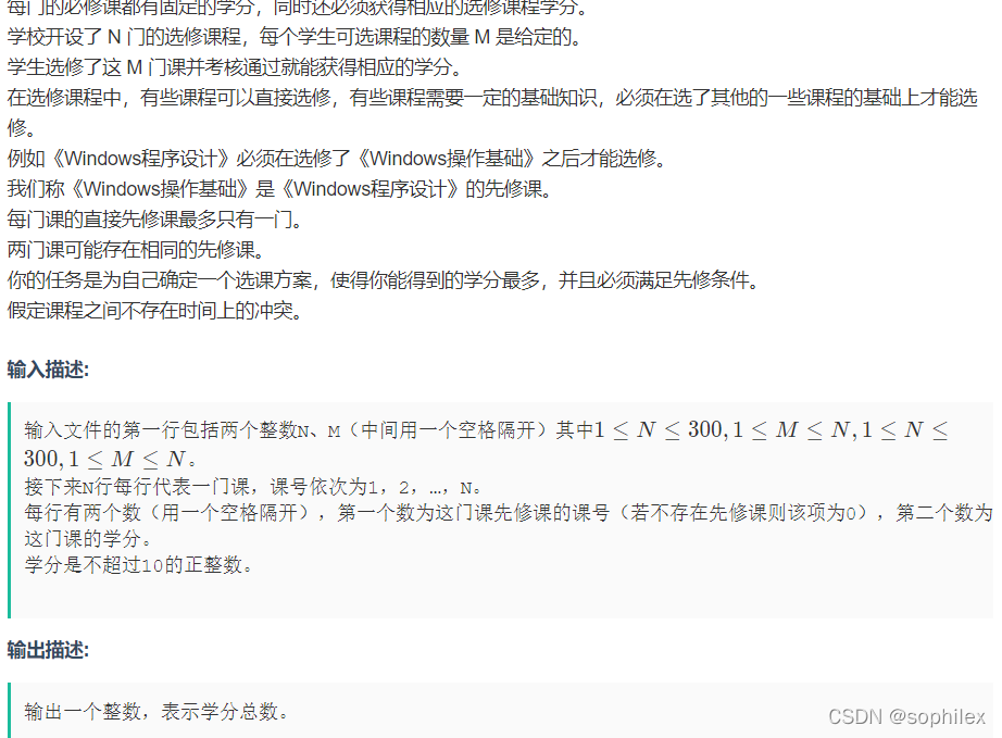 考虑dp,首先是数组的意义,不难想到用dp【i】【j】来表示以i为根,选j门课能获得的最大学分。但是这里因为我们是以0作为根的,所以最后肯定是要输出dp【0】【m】,但是0它不是一门课,所以m此时其实是加了一个1(就是m++),因为0肯定是会被选上的。或者我们就干脆直接让全体都-1,那么dp【0】【m】中的m就还是一开始的m,那么初始化时就应该是让dp【i】【0】=num【i】(num表示学分)。