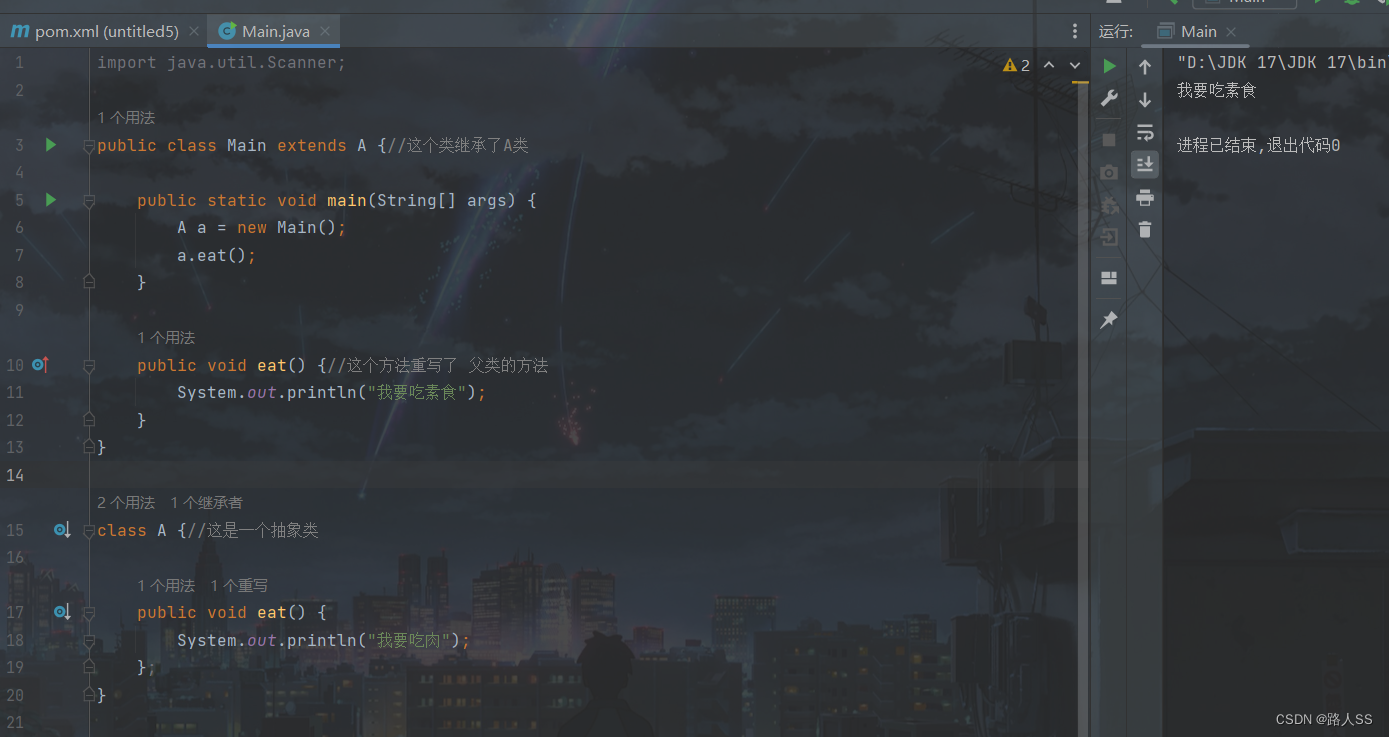 public class Main extends A {//这个类继承了A类public static void main(String[] args) {A a = new Main();a.eat();}public void eat() {//这个方法重写了 父类的方法System.out.println("我要吃素食");}