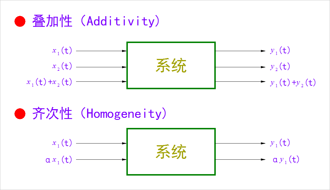 今天在信号与系统课程中,讲解线性系统需要同时满足两个特性: 一是叠加性。 当两个输入信号x1,x2分别引起输出y1,y2。 那么x1+x2所引起的系统输出等于y1+y2。 第二个特性是齐次性, 输入信号x1引起系统的输出为 y1。 对应 a 倍的 x1 引起系统输出是 a 倍的y1。 这两个特性需要分别进行验证。