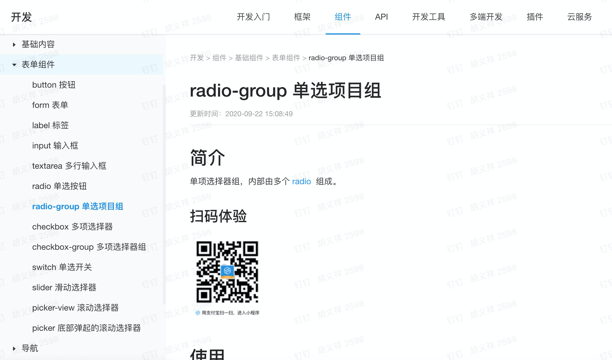 2、钉钉UI各种组件属性及例子,包括各种表单组件 ,文档地址在这:https://opendocs.alipay.com/mini/component/radio-group 截图如下: