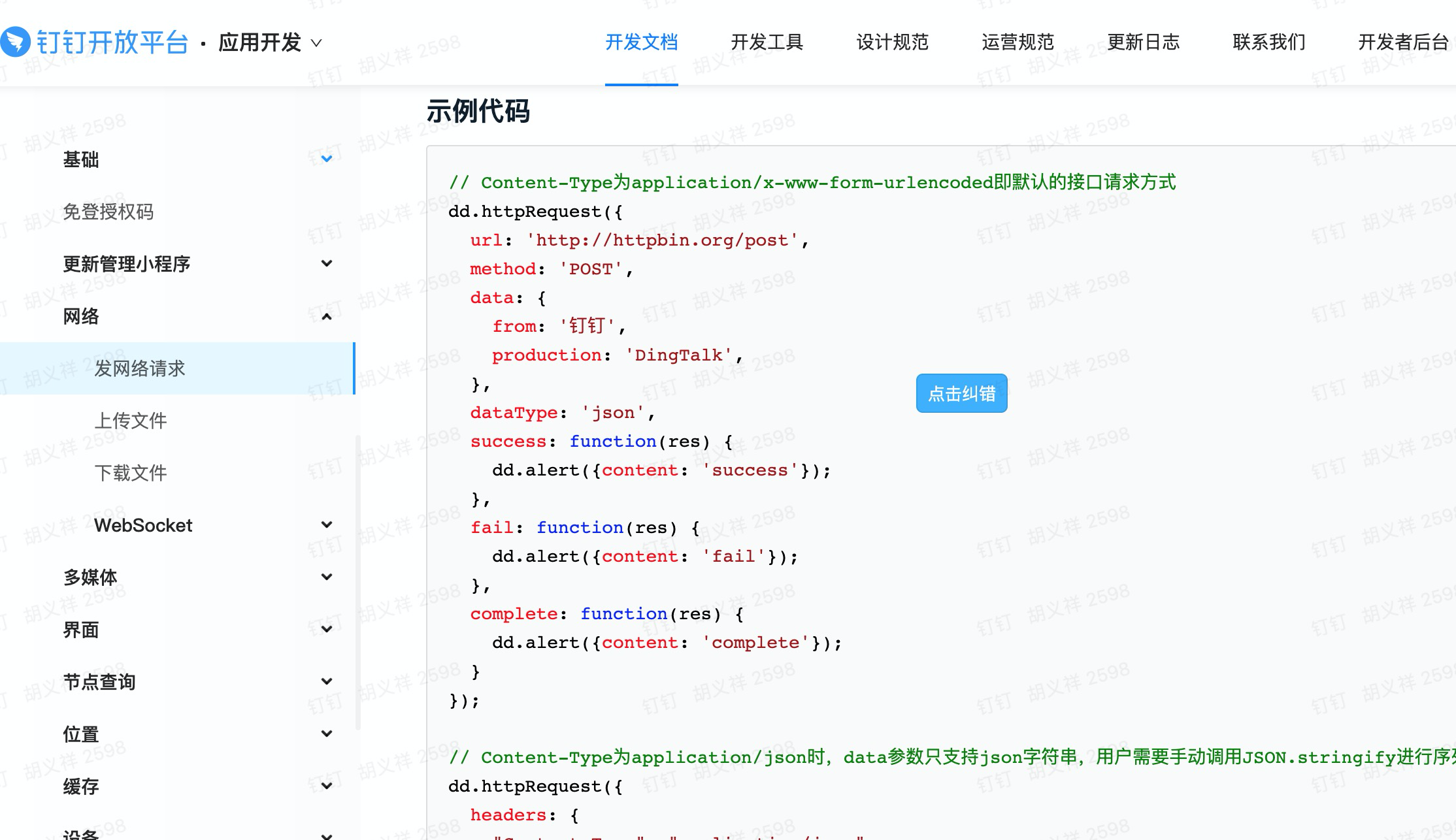 3、找不到钉钉小程序调用接口的例子,文档地址在这:https://developers.dingtalk.com/document/app/send-network-requests?spm=ding_open_doc.document.0.0.18a66573VUyxB4#topic-2024729 截图如下: