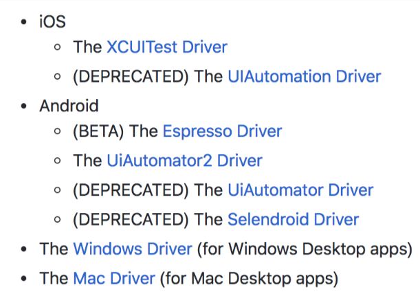 而 Appium 几乎包括了所有的优势,可谓是集大成者,为何?再来看 Appium 官方 GitHub 给出的底层引擎实现说明(很多已经淘汰,我们学习推荐使用的即可):