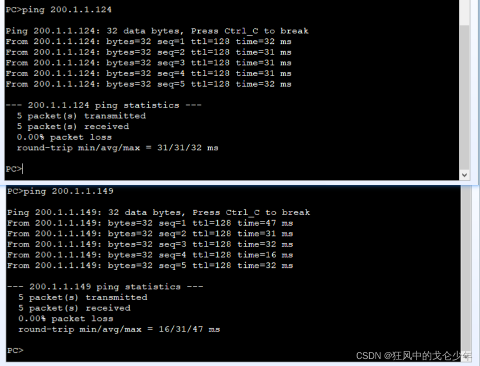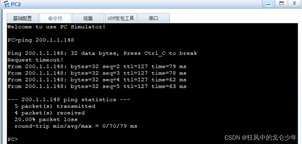 不同网段 PC 2 (200.1.1.125)ping PC 5 (200.1.1.148) 可ping通