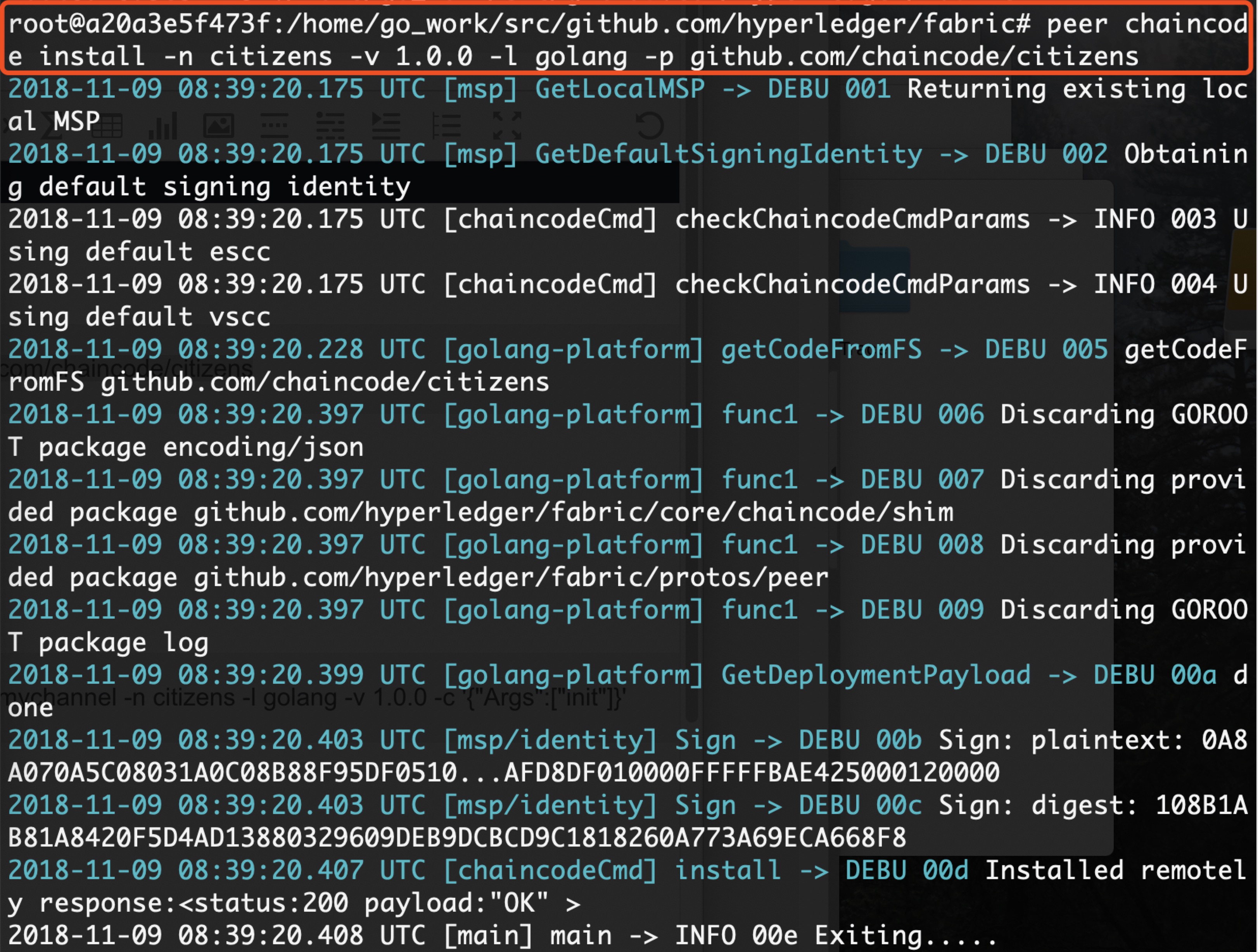 peer chaincode install -n citizens -v 1.0.0 -l golang -p github.com/chaincode/citizens