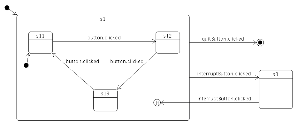 子状态可以是一个final状态;当进入一个final子状态时,父状态会发出finished() 信号。下图显示了一个组合状态s1在做了一系列的处理后进入了一个final状态: