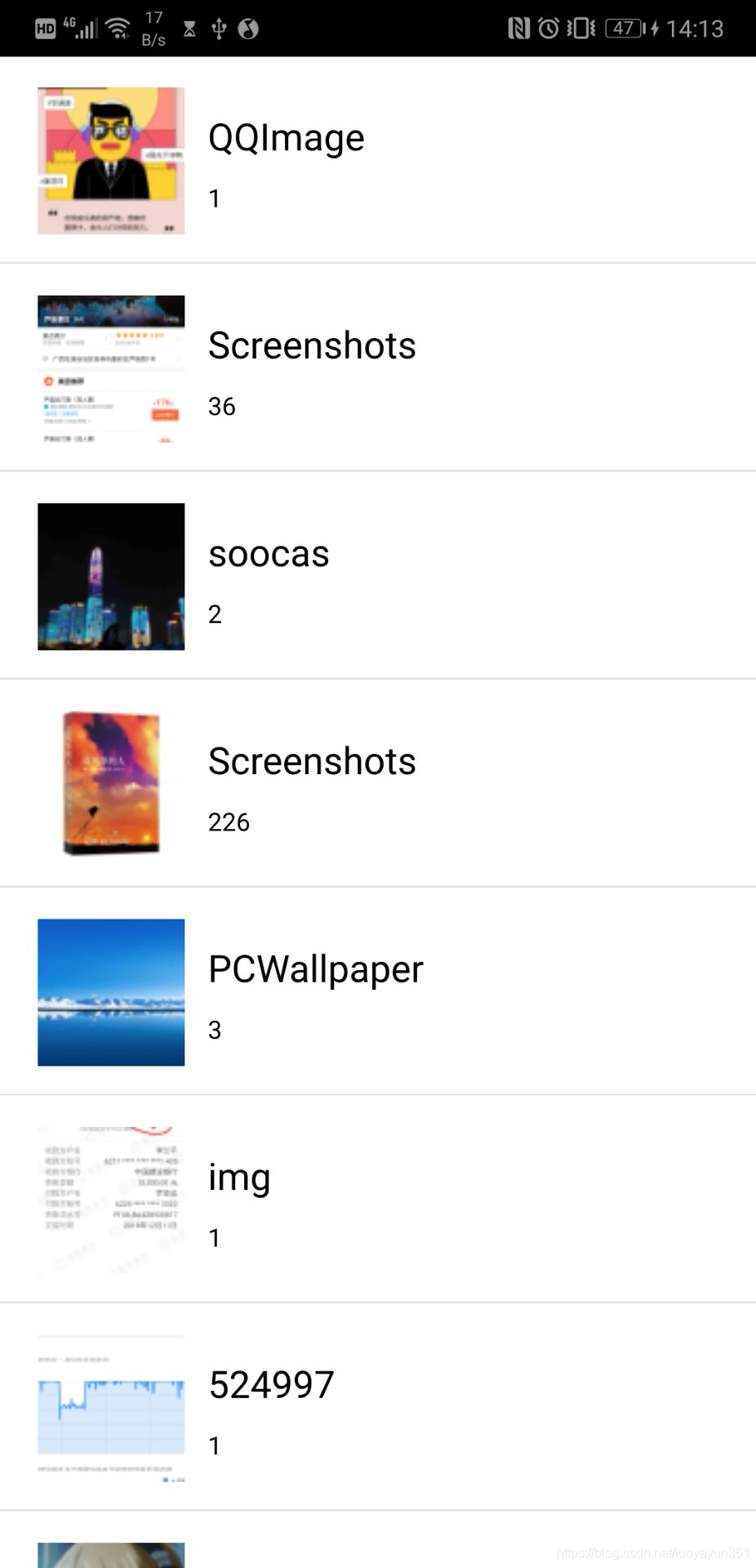 通过Android原生接口,可以直接获取到手机中所有包含相片的文件夹的信息,包括相册的路径,将信息解析(相册封面、数量、名称)过后传到QML端。