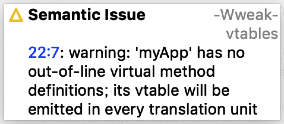如果在头文件中定义了一个类并且具有vtable(它具有虚方法或者它来自具有虚方法的类),则它必须始终在类中具有至少一个外联虚拟方法。 如果没有这个,编译器会将vtable和RTTI复制到每个.o文件中,其中#include标题,膨胀.o文件大小和增加链接时间。