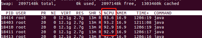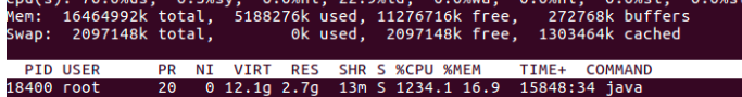 通过top命令发现某个java服务占用1234%的CPU,如图: