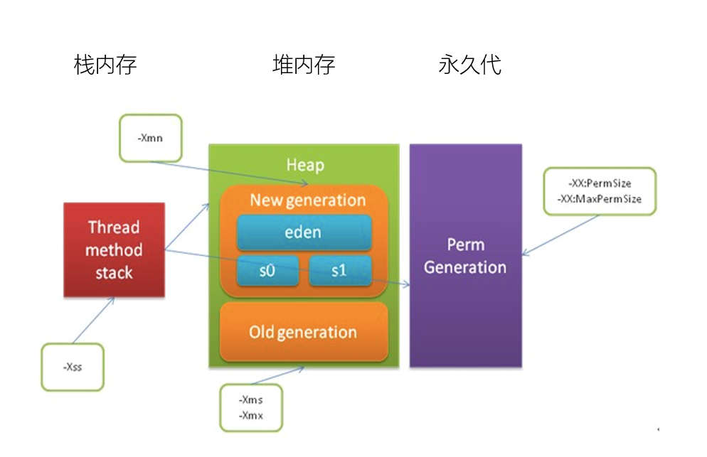 从上图可以看出,整个JVM内存是由栈内存、堆内存和永久代构成。