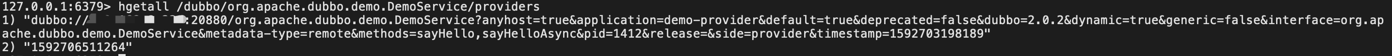 <dubbo:application metadata-type="remote" name="demo-provider"/><dubbo:metadata-report address="redis://localhost:6379"/><dubbo:registry protocol="redis" address="localhost:6379" /><bean id="demoService" class="org.apache.dubbo.demo.provider.DemoServiceImpl"/><dubbo:service interface="org.apache.dubbo.demo.DemoService" ref="demoService"/>