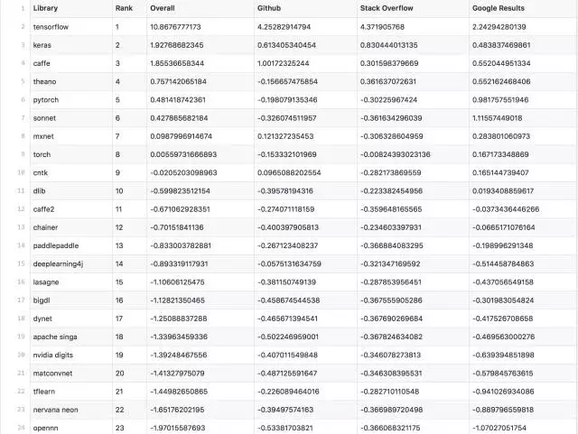 首先,我们从 5 个不同的来源中生成了一个 23 个开源深度学习库的列表,然后收集它们的所有指标,并给出排名。GitHub 数据基于 star 指标和 fork 指标,Stack Overflow 数据基于标签和包含软件包名称的问题,谷歌搜索结果基于过去 5 年内谷歌搜索的结果总数目和过去 3 个月对比之前 3 个月计算得出的季度增长率。