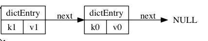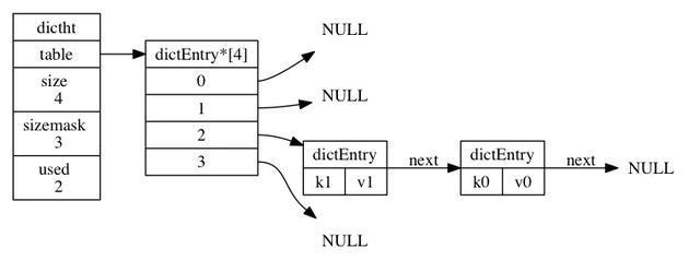 如上图展示了一个大小为4的table中的哈希节点情况,其中k1和k0在index=2发生了哈希冲突,进行开链表存在,本质上是先存储的k0,k1放置是发生冲突为了保证效率直接放在冲突链表的最前面,因为该链表没有尾指针。
