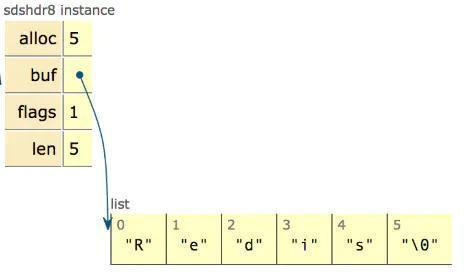从图中可以知道sds本质分为三部分:header、buf、null结尾符,其中header可以认为是整个sds的指引部分,给定了使用的空间大小、最大分配大小等信息,再用一张网上的图来清晰看下sdshdr8的实例: