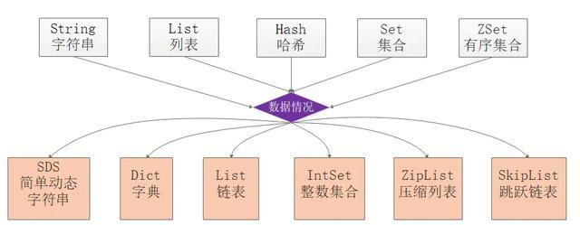 Redis为了平衡空间和时间效率,针对value的具体类型在底层会采用不同的数据结构来实现,其中哈希表和压缩列表是复用比较多的数据结构,如下图展示了对外数据类型和底层数据结构之间的映射关系: