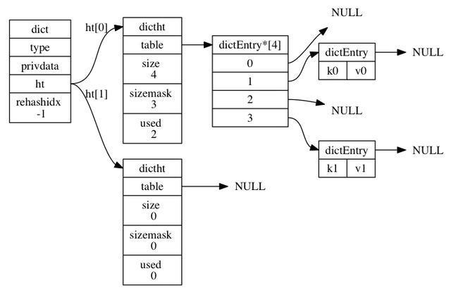 //哈希节点结构typedef struct dictEntry { void *key; union { void *val; uint64_t u64; int64_t s64; double d; } v; struct dictEntry *next;} dictEntry;//封装的是字典的操作函数指针typedef struct dictType { uint64_t (*hashFunction)(const void *key); void *(*keyDup)(void *privdata, const void *key); void *(*valDup)(void *privdata, const void *obj); int (*keyCompare)(void *privdata, const void *key1, const void *key2); void (*keyDestructor)(void *privdata, void *key); void (*valDestructor)(void *privdata, void *obj);} dictType;/* This is our hash table structure. Every dictionary has two of this as we * implement incremental rehashing, for the old to the new table. *///哈希表结构 该部分是理解字典的关键typedef struct dictht { dictEntry **table; unsigned long size; unsigned long sizemask; unsigned long used;} dictht;//字典结构typedef struct dict { dictType *type; void *privdata; dictht ht[2]; long rehashidx; /* rehashing not in progress if rehashidx == -1 */ unsigned long iterators; /* number of iterators currently running */} dict;复制代码