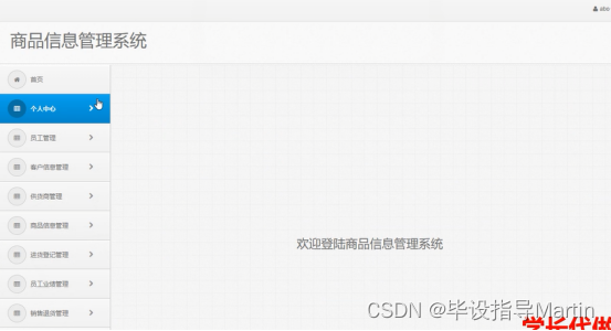管理员登录进入商品信息管理系统可以查看;首页、个人中心、员工管理、客户信息管理、供应商管理、商品信息管理、进货登记管理、员工业绩管理、销售退货管理、采购退货管理、公告信息管理等内容,如图5-2所示。