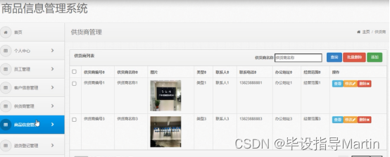 供应商管理,在供应商管理页面可以填写供应商编号、供应商姓名、照片、类型、联系电话、供应商地址等等进行添加,修改,删除或查看详细内容等操作,如图5-4所示。