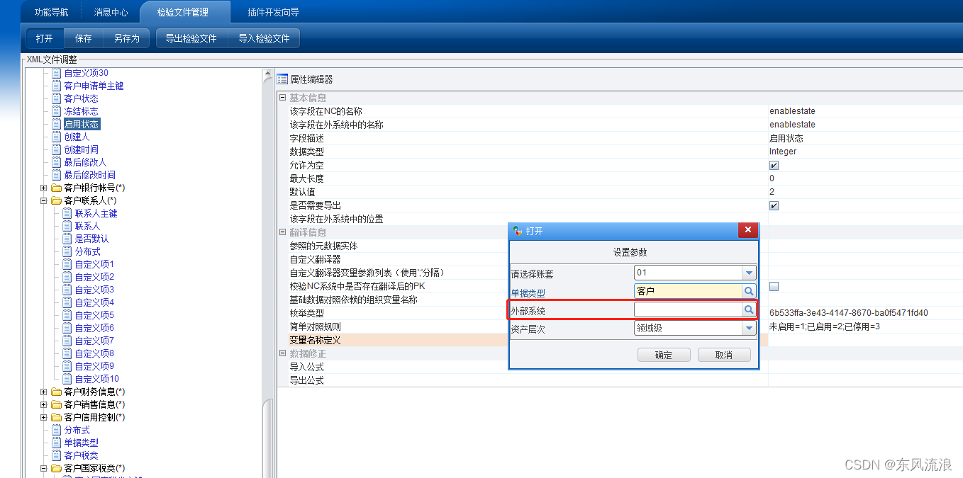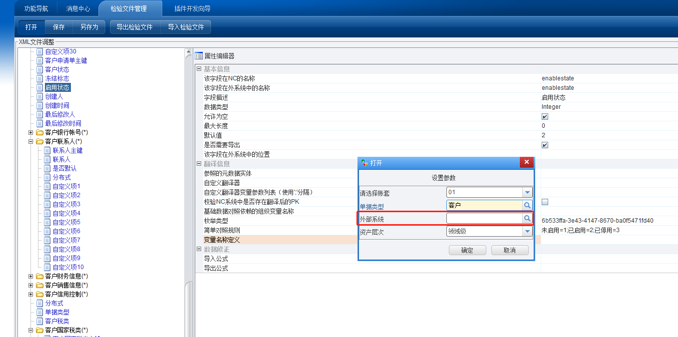 单据扩展自定义项字段,外部交换平台入参日志文件里面包含了该字段,翻译后的文件里面没有该字段。需要重新定义该单据的检验文件。但是在检验文件管理菜单配置完成以后不生效,需要在插件开发向导里面设置、