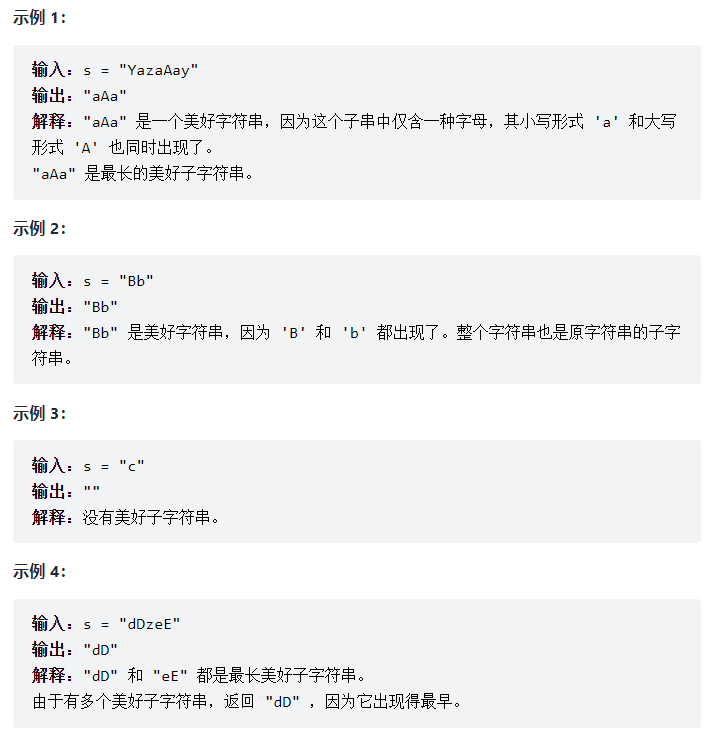 给你一个字符串 s ,请你返回 s 最长的 美好子字符串 。如果有多个答案,请你返回 最早 出现的一个。如果不存在美好子字符串,请你返回一个空字符串。