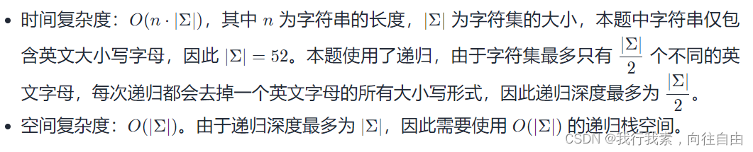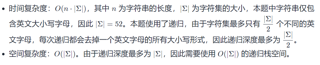 题目关于美好字符串的定义为: 字符串中的每个字母的大写和小写形式同时出现在该字符串中。检测时,由于英文字母 ‘a’−‘z’ 最多只有 2626 个, 因此可以利用二进制位来进行标记,lower 标记字符中出现过小写英文字母,upper 标记字符中出现过大写英文字母。如果满足 lower=upper ,我们则认为字符串中所有的字符都满足大小写形式同时出现,则认定该字符串为美好字符串。