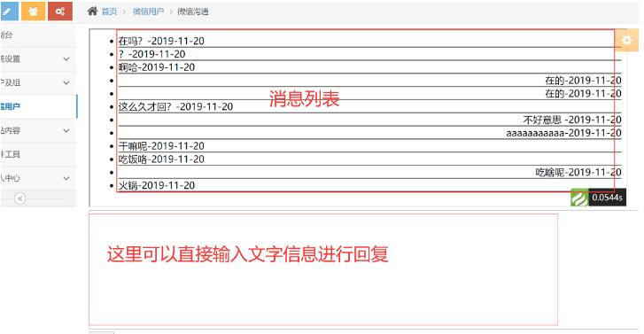 public function chat(){if(IS_POST){$mes = M('wxuser_'.$_POST['id']);$data['nr'] = strtolower($_POST['nr']);$data['status'] = 0;$data['type'] = 2;$data['addtime'] = time();$data['updatetime'] = time();$mes->add($data);$user = M('wxuser')->where("id=".$_POST['id'])->find();$accesstoken = getAccessToken();$text = '{"touser":"'.$user['openid'].'","msgtype":"text","text":{"content":"'.$_POST['nr'].'"}}';$url = "https://api.weixin.qq.com/cgi-bin/message/custom/send?access_token=$accesstoken"; 调用 微信客服接口发消息$send_result = httpPost($url, $text);$this->success('OK');}else{$uid = $_GET['id'];$this->assign('uid',$uid);$this->display();}}
