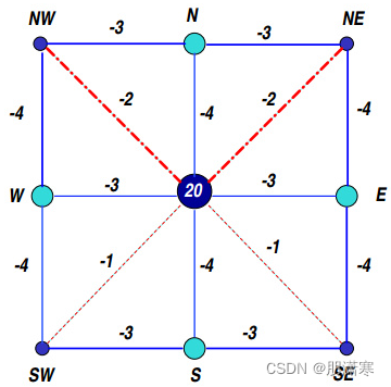 这段代码则重分配强连接点的边权给自身与插值点都相邻的粗网格点。为了形象地描述这个过程,引入链接中的这个例子:图中中心点为 ui,待插值。N, W, S, E 四个点是粗网格点,NE, NW 是 ui 强连接的细网格点,SE, SW 是 uiui 弱连接的细网格点,边上各数值为边权。
