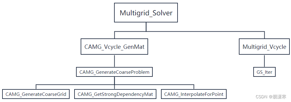 回到CAMG_Vcycle_GenMat,不断重复上述CAMG_GenerateCoarseProblem过程直到最粗一级网格维数小于直接求解判据为止。至此代数多重网格的准备阶段(setup)完成。