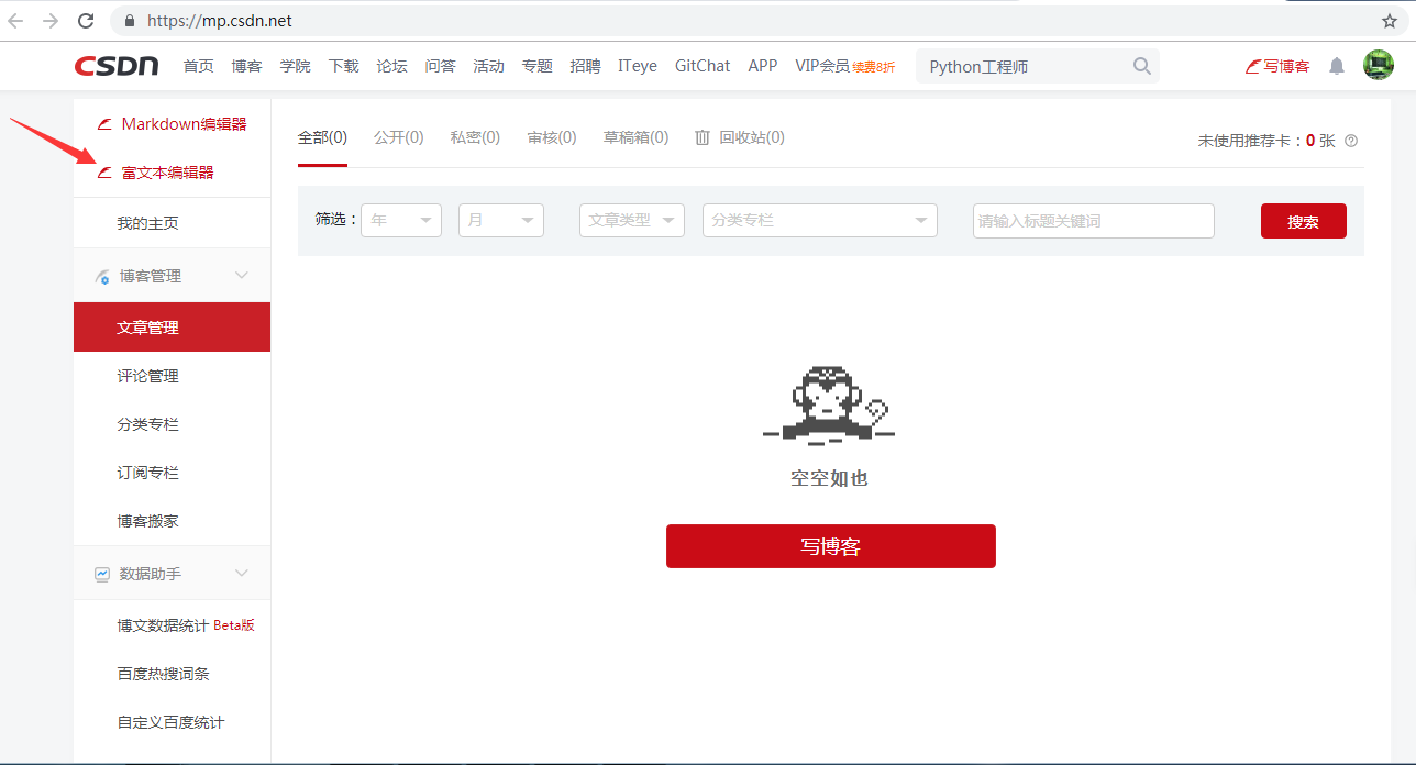 第一步,首先注册完账号之后打开自己博客头像里的博客管理