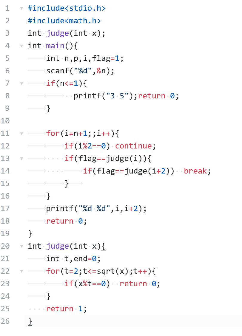 现在,对于给定的整数n, 请寻找大于n的最小的一对孪生素数p和q(q=p+2)。