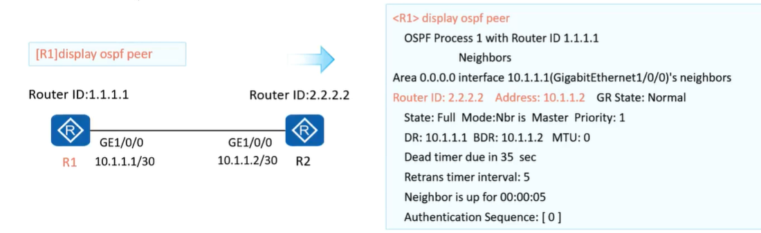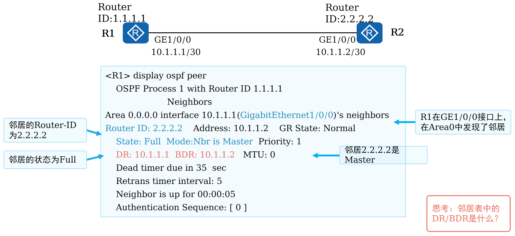 OSPF邻居表显示了OSPF路由器之间的邻居状态,使用display ospf peer查看。