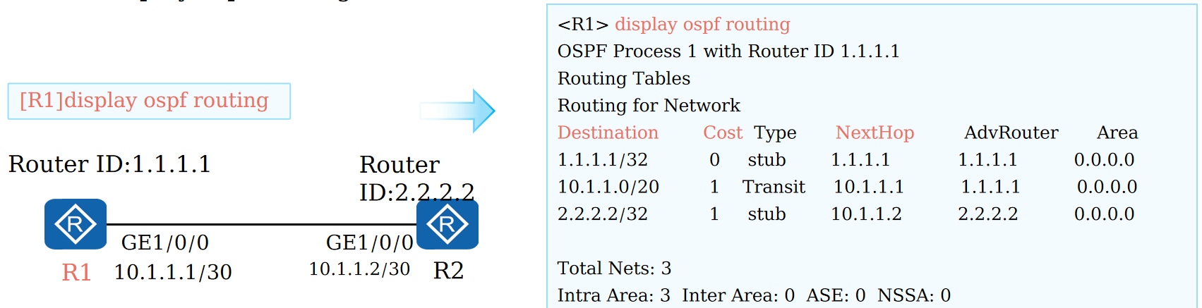 OSPF路由表和路由器路由表是两张不同的表项。本例中OSPF路由表有三条路由。