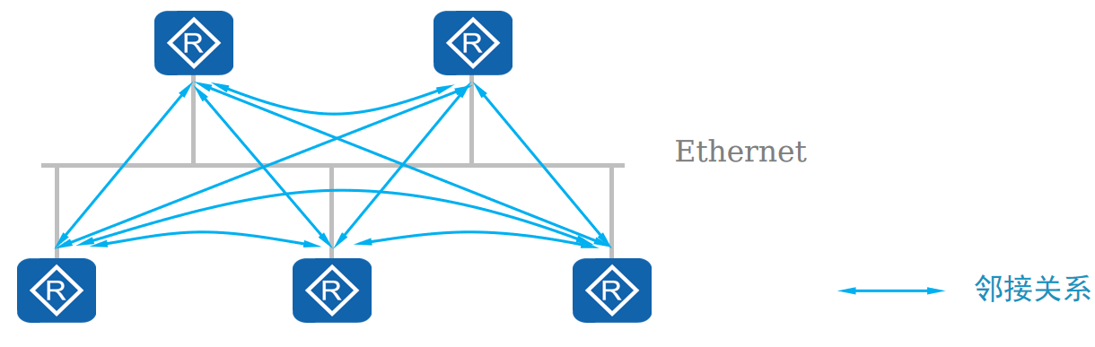 在MA网络中,如果每台OSPF路由器都与其他的所有路由器建立OSPF邻接关系,便会导致网络中存在过多的OSPF邻接关系,增加设备负担,也增加了网络中泛洪的OSPF报文数量。