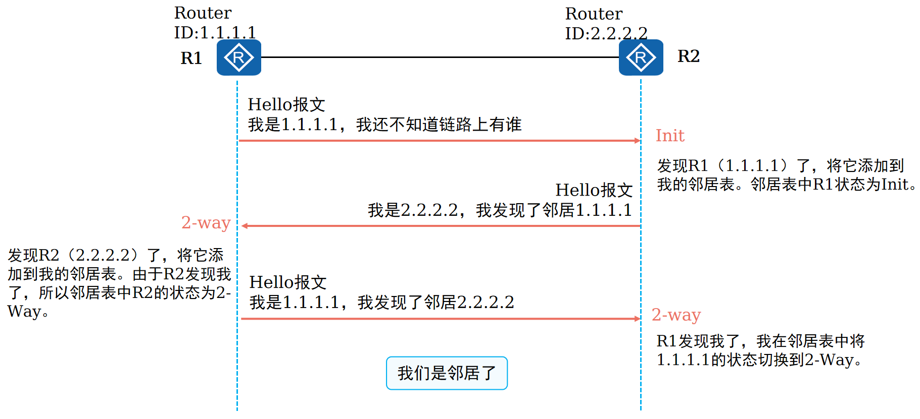 考虑一种简单的拓扑,两台路由器直连。在双方互联接口上激活OSPF,路由器开始发送及侦听Hello报文。在通过Hello报文发现彼此后,这两台路由器便形成了邻居关系。