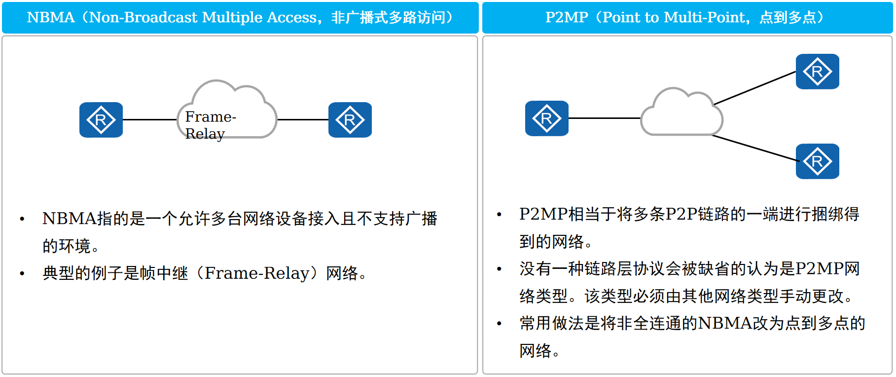 如图所示,OSPF的有四种网络类型,Broadcast、NBMA、P2MP和P2P。