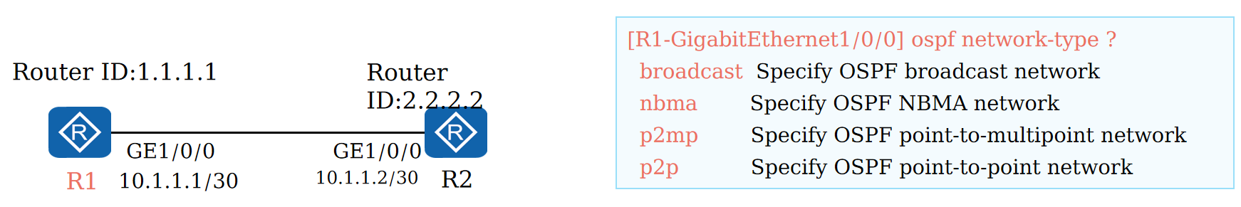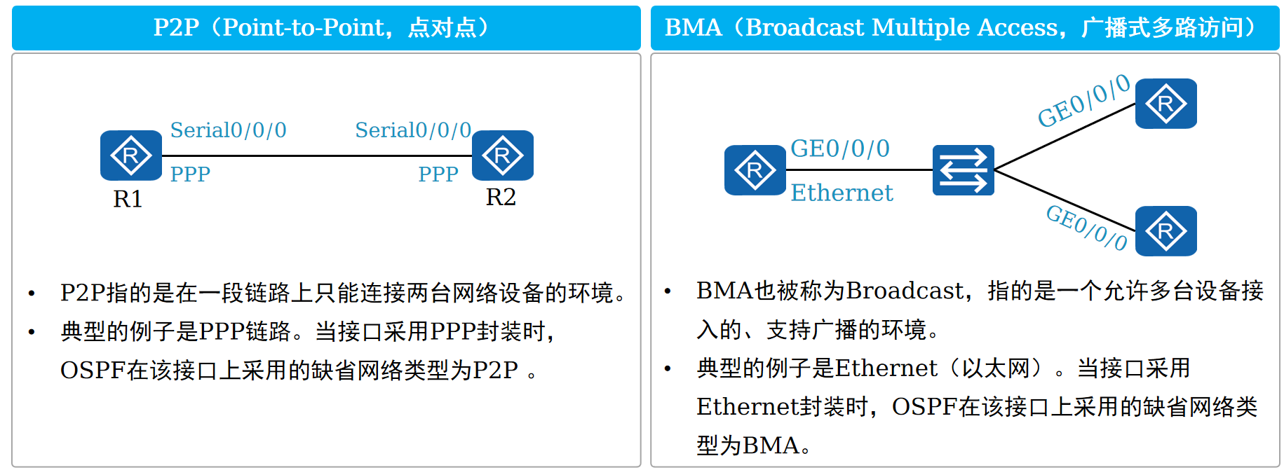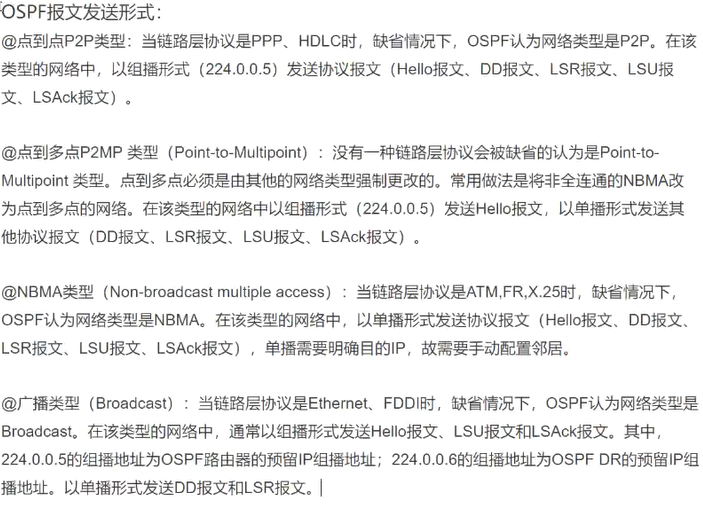 OSPF网络类型是一个非常重要的接口变量,这个变量将影响OSPF在接口上的操作,例如采用什么方式发送OSPF协议报文,以及是否需要选举DR、BDR等。