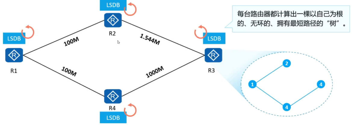 OSPF路由器将网络中的LS信息收集起来,存储在LSDB中。路由器都清楚区域内的网络拓扑结构,这有助于路由器计算无环路径。