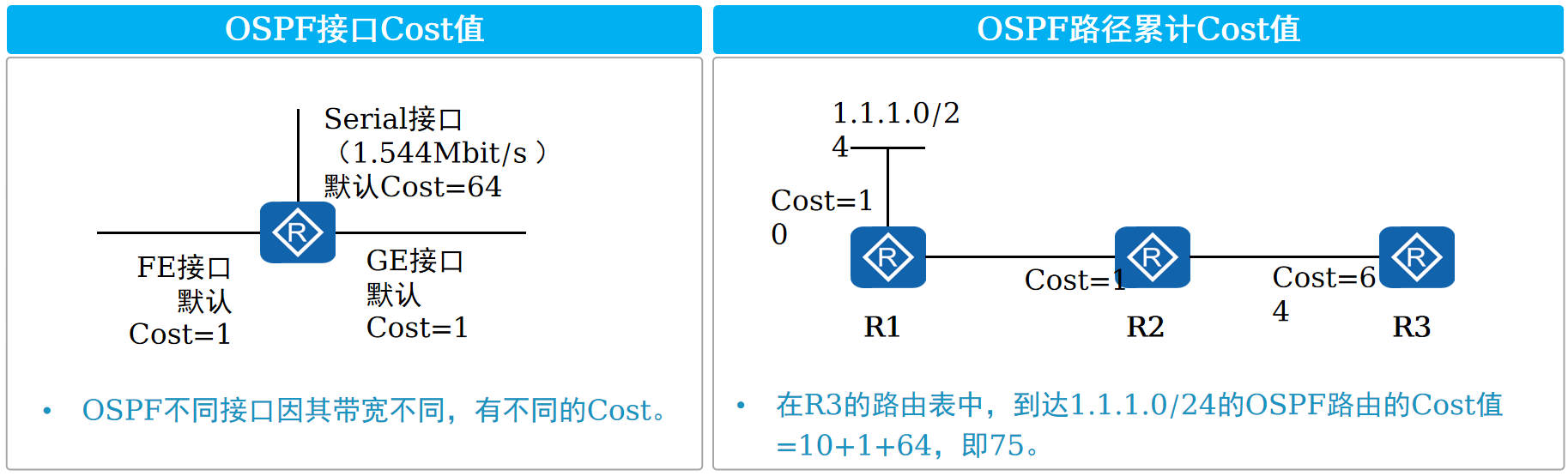 OSPF使用Cost(开销)作为路由的度量值。每一个激活了OSPF的接口都会维护一个接口Cost值,缺省时接口Cost值=100 Mbit/s /接口带宽(参考带宽/实际带宽,参考带宽默认情况下是100 Mbit/s)。其中100 Mbit/s为OSPF指定的缺省参考值,该值是可配置的。