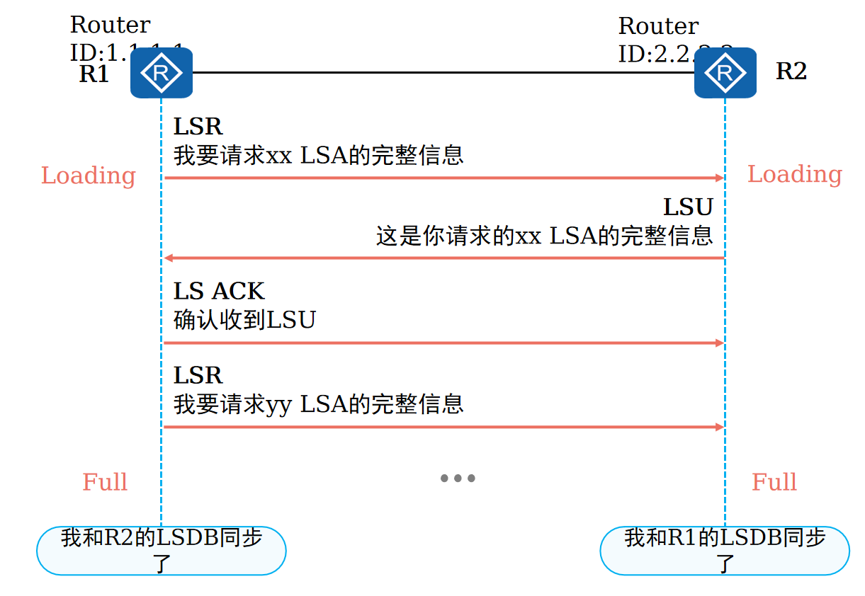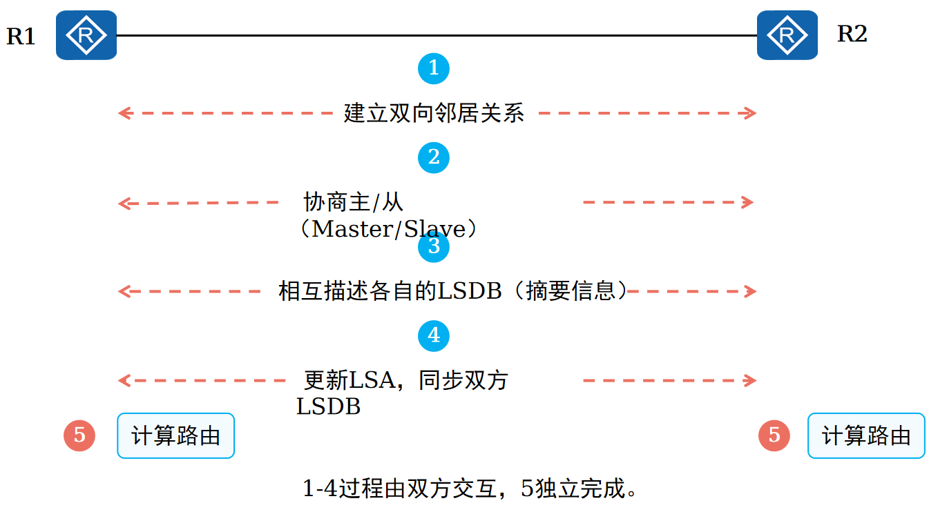 邻居关系的建立只是一个开始,后续会进行一系列的报文交互,例如前文提到的DD、LSR、LSU和LS ACK等。当两台路由器LSDB同步完成,并开始独立计算路由时,这两台路由器形成了邻接关系。