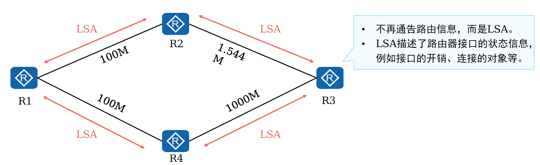 与距离矢量路由协议不同,链路状态路由协议通告的的是链路状态而不是路由表。运行链路状态路由协议的路由器之间首先会建立一个协议的邻居关系,然后彼此之间开始交互LSA(Link State Advertisement,链路状态通告)。
