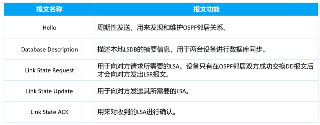 OSPF有五种类型的协议报文。这些报文在OSPF路由器之间交互中起不同的作用。
