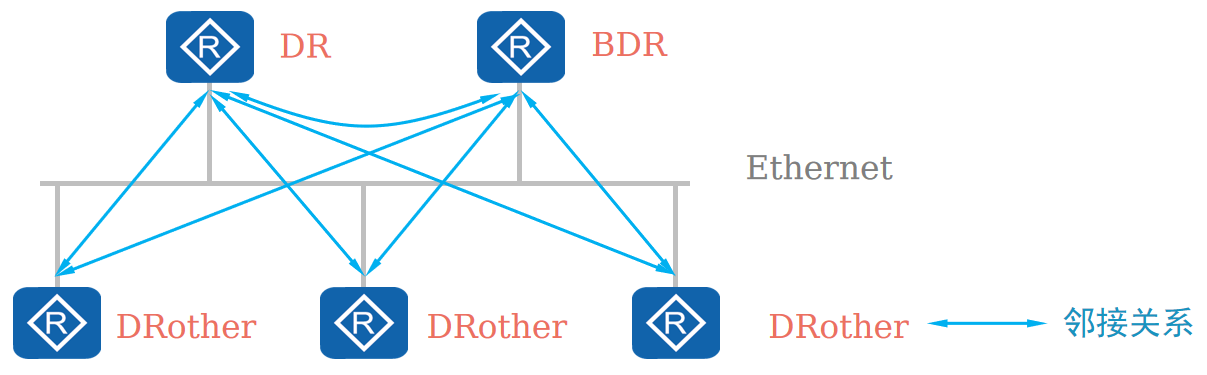 DRother只和DR/BDR建立邻接关系,DRother之间只建立邻居关系